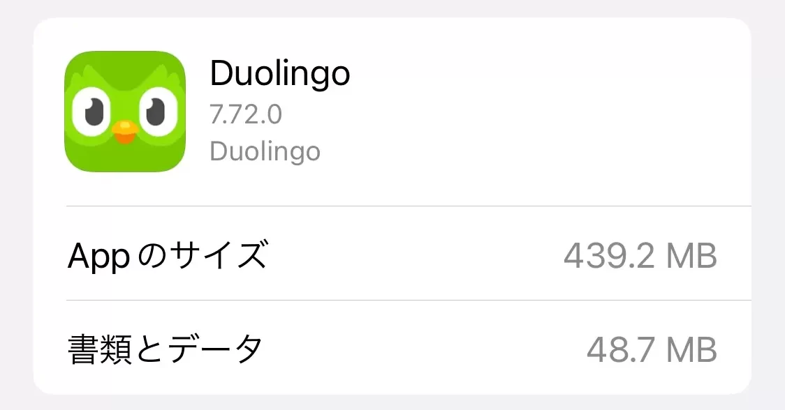 iPhoneストレージを確認すると、写真→LINEと続いて、なんとDuolingoが1.58GBで第3位。