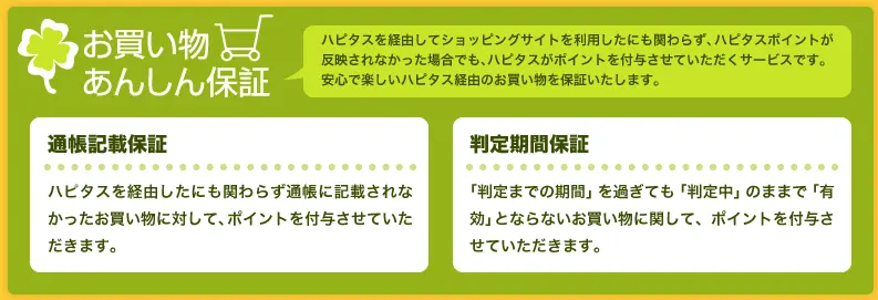 また、「お買い物あんしん保証」は、ちゃんとハピタス寄ったのにポイントが付かない、ということがないように全力でサポートしてくれて安心です。