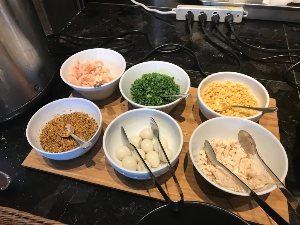 麺を茹でて、薬味をいれ、スープをかければ完成です。